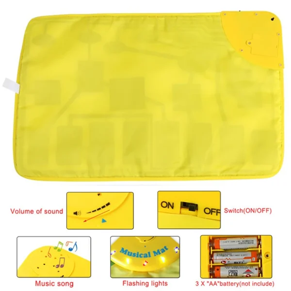 این سفره موزیکال با طراحی رنگارنگ و تصاویر کارتونی حیوانات مختلف مثل اردک، پرنده، سگ، گربه، قورباغه و راکون، توجه کودکان را به خود جلب میکند و محیطی آموزشی و شاد برای بازی فراهم میآورد.